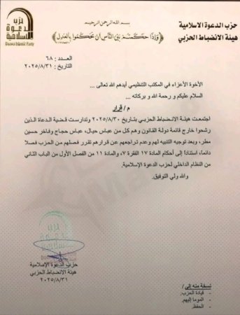 أعلنت هيئة الانضباط الحزبي في حزب الدعوة الإسلامية، اليوم الجمعة (5 أيلول 2025)، فصل ثلاثة من أعضاء الحزب فصلاً دائماً، بسبب ترشحهم خارج قائمة ائتلاف "دولة القانون".